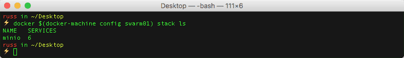 docker $(docker-machine config swarm01) stack services minioAs you can see from the terminal output below, I had the six services with each service having one of one containers running;