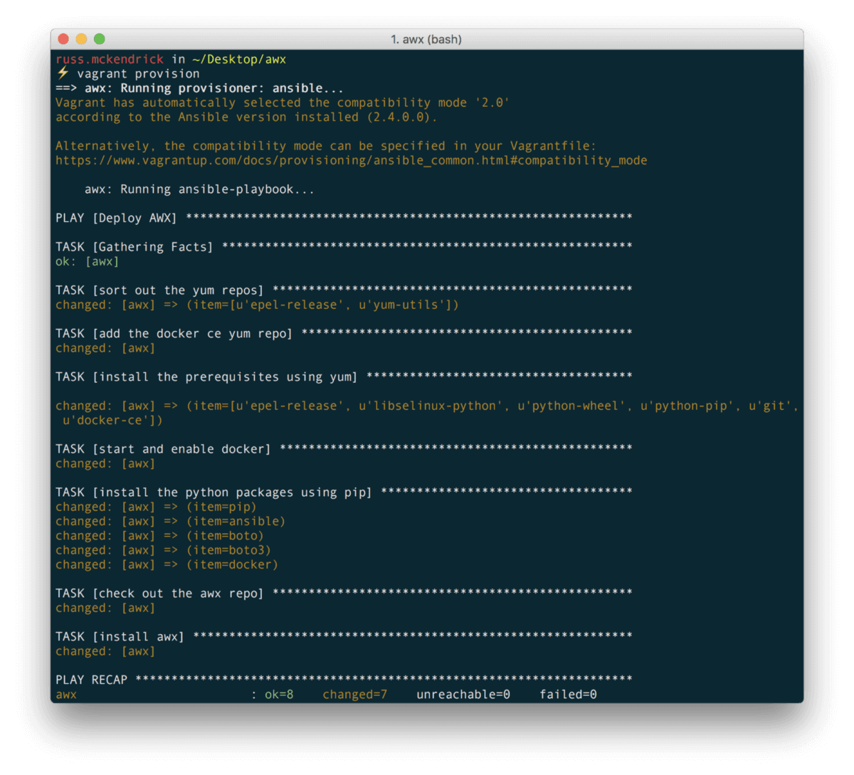 endThis launches the following playbook.yml which prepares the CentOS 7 box by installing Docker and the other prerequisites need to build and launch AWX;