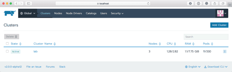 Now that I had my three node cluster regisgered with Rancher I could start to use it, to do this I Clicked on Global in the top right and selected the Cluster:lab, this took me to the overview page;