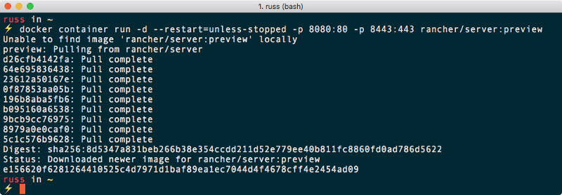 $ docker container run -d \ --restart=unless-stopped \ -p 8080:80 \ -p 8443:443 \ rancher/server:previewI checked that the container was up and running by running;