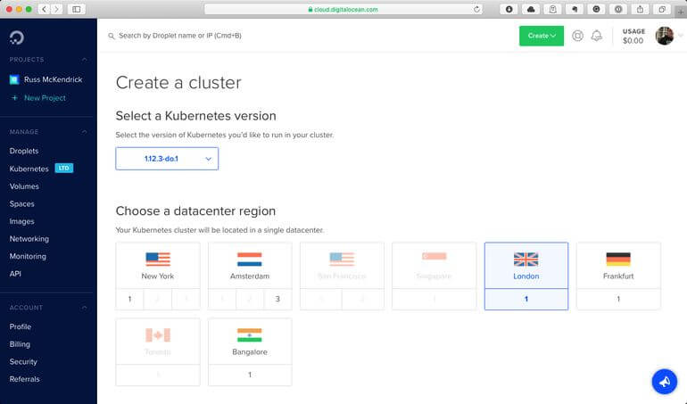 As you can see from the screen above, I used the latest version of Kubernetes supported by DigitalOcean, and as I am based in the UK, I choose to use DigitalOceans London datacentre region.