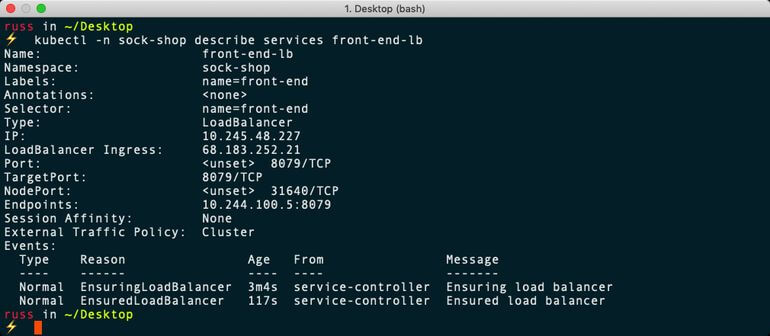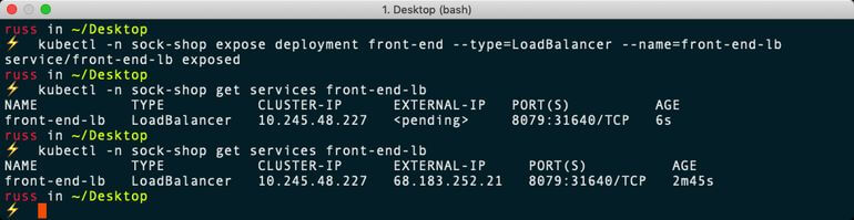 $ kubectl -n sock-shop expose deployment front-end --type=LoadBalancer --name=front-end-lb$ kubectl -n sock-shop get services front-end-lb