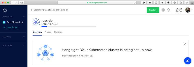 The default number of nodes is 3, which at $10 per month per node would have meant that I would have been able to run a cluster with 6GB of RAM and 3 x vCPUs for $30 per month. Once I was happy with my settings I clicked on the Create Cluster button at the bottom of the page.