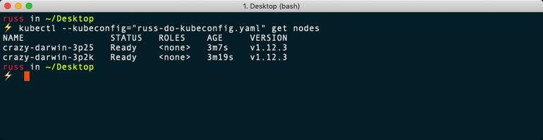$ kubectl --kubeconfig="russ-do-kubeconfig.yaml" get nodesAs you can see, this returned two nodes, which is correct. Now, passing the configuration file each time I want to interact with my cluster can be a chore, so let’s look at using the excellent KubeContext by Hasan Turken, which is available from the Mac App Store.
