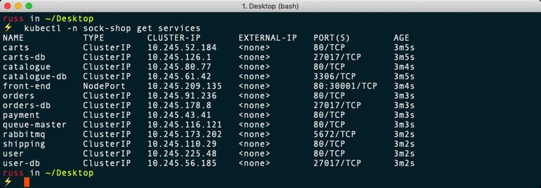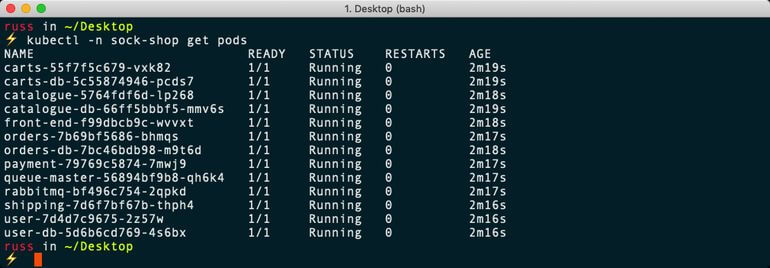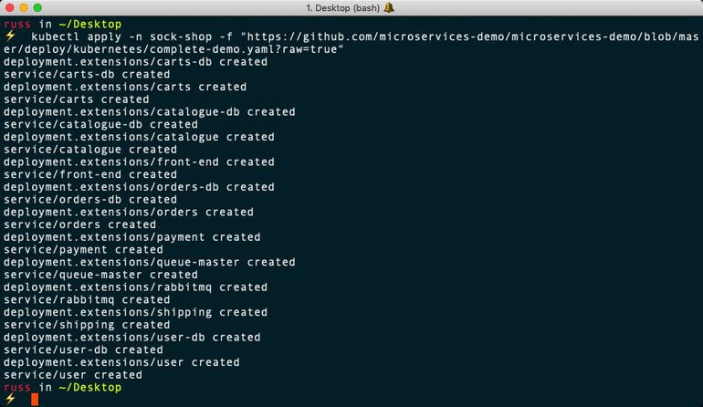 $ kubectl create namespace sock-shop$ kubectl apply -n sock-shop -f "https://github.com/microservices-demo/microservices-demo/blob/master/deploy/kubernetes/complete-demo.yaml?raw=true"$ kubectl -n sock-shop get pods$ kubectl -n sock-shop get servicesThis will download the containers and launch the application.