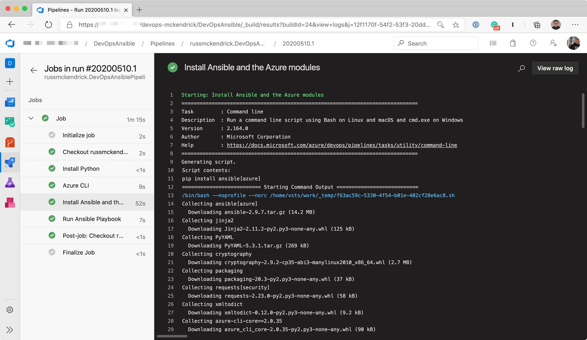 The next step installs Ansible along with the Azure Modules: