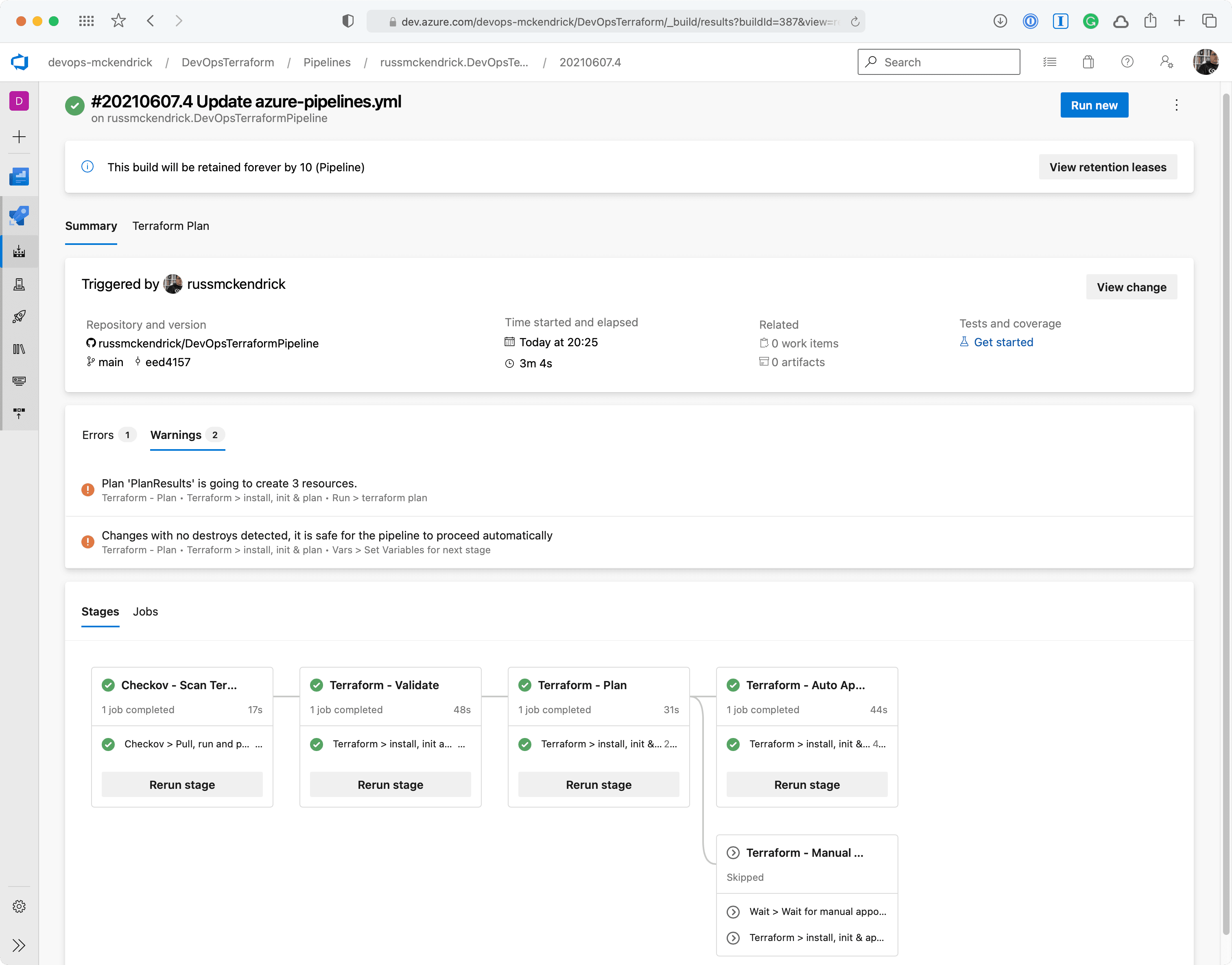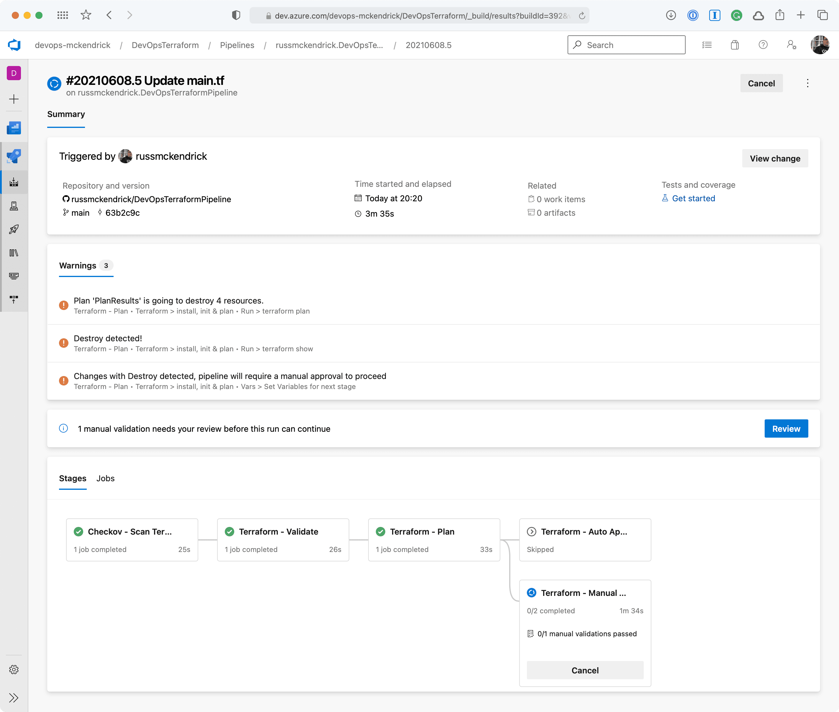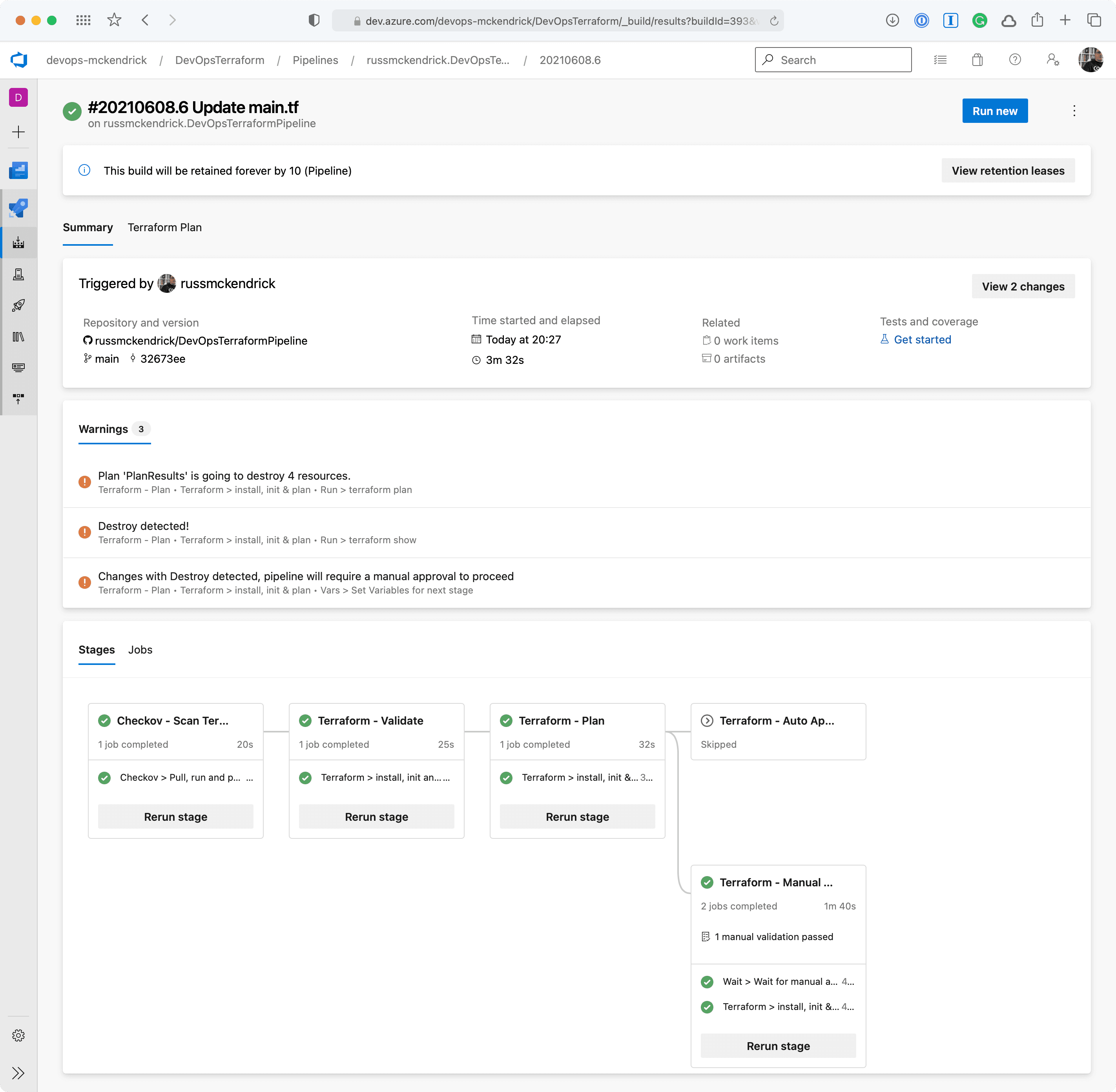 The pipeline itself has expanded a little and it now not only uses stages but also depending what Terraform is planning on doing it will trigger a manual approval process should there be any resources being destroyed.