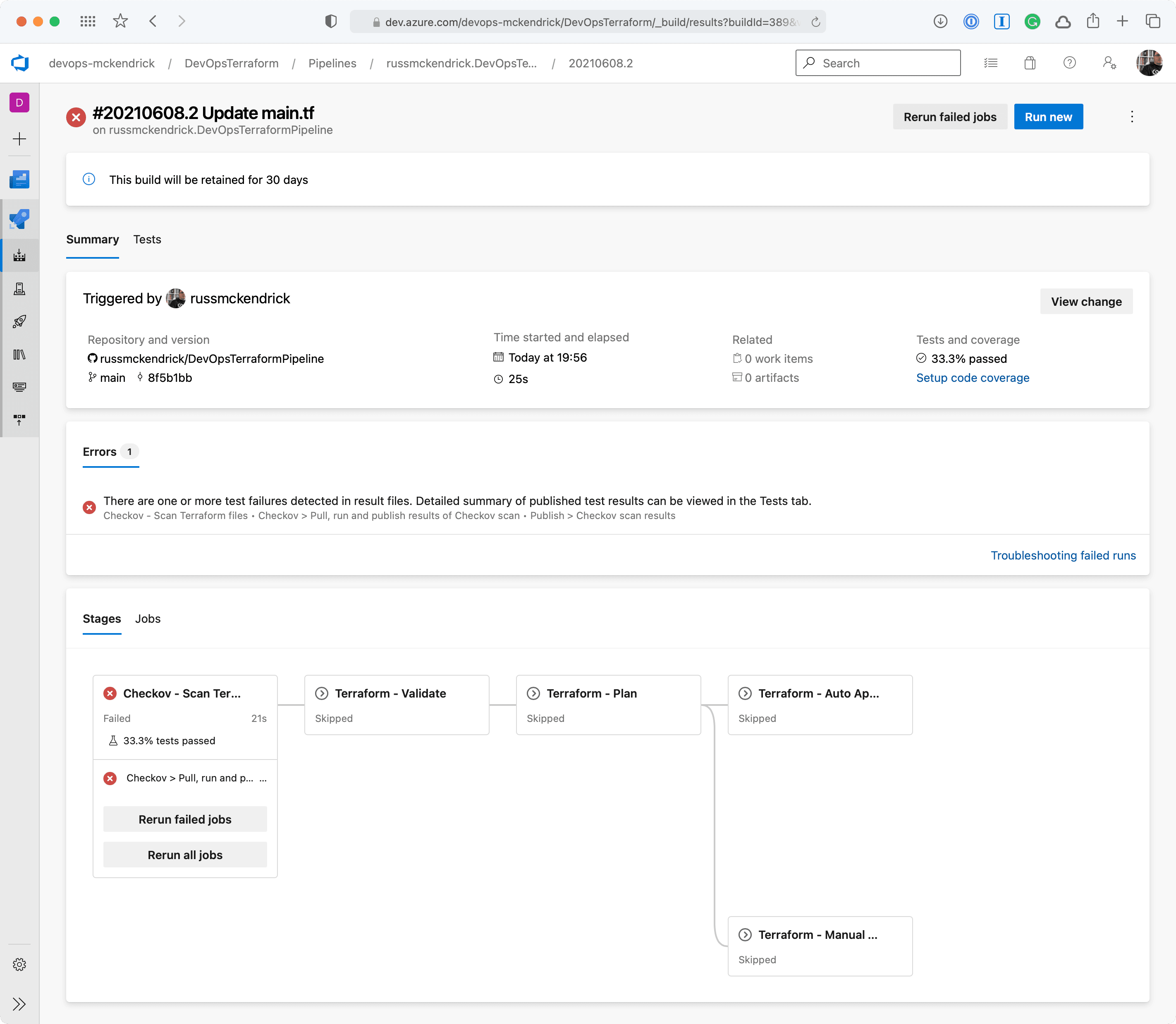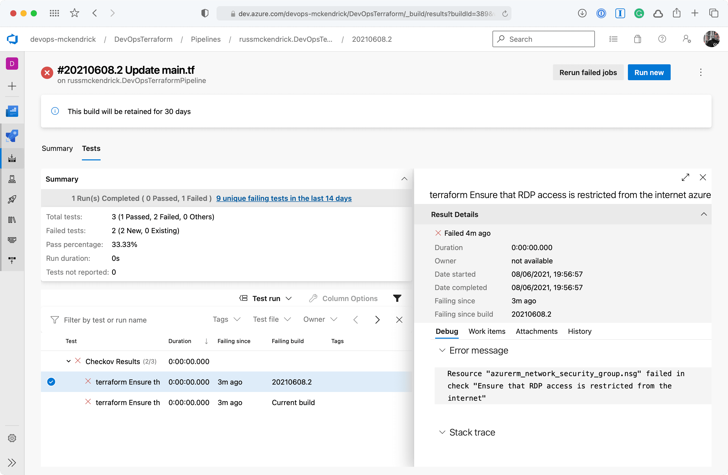 Whoops, the Checkov stage failed, clicking on Tests should give us more information as to why;