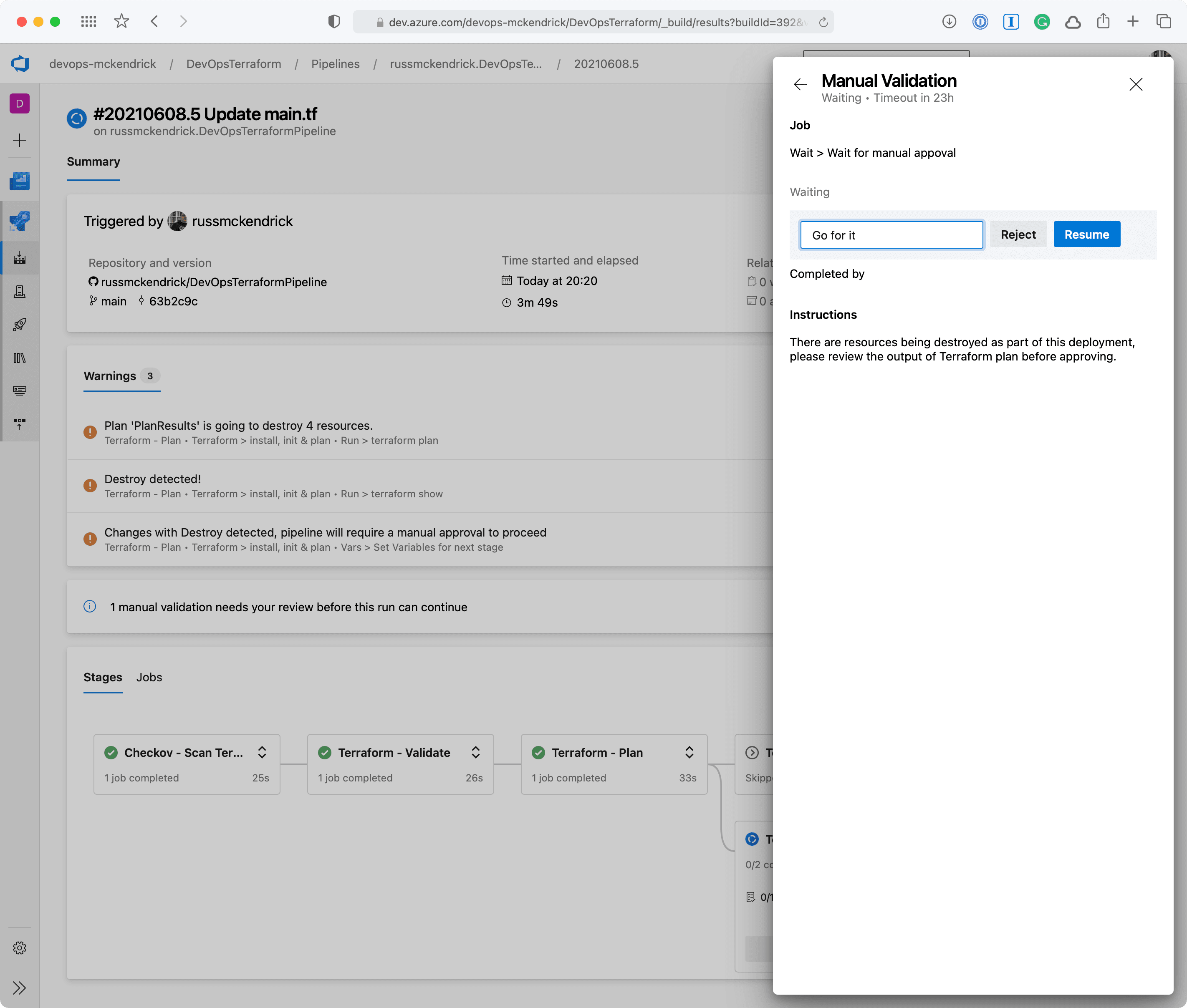 and effects the change. - Terraform Apply (Manual Approval), if the Terraform Plan stage determines that the changes to the state includes any resources being destroyed then this stage is ran, it triggers a manual approval task prompting someone to check before the