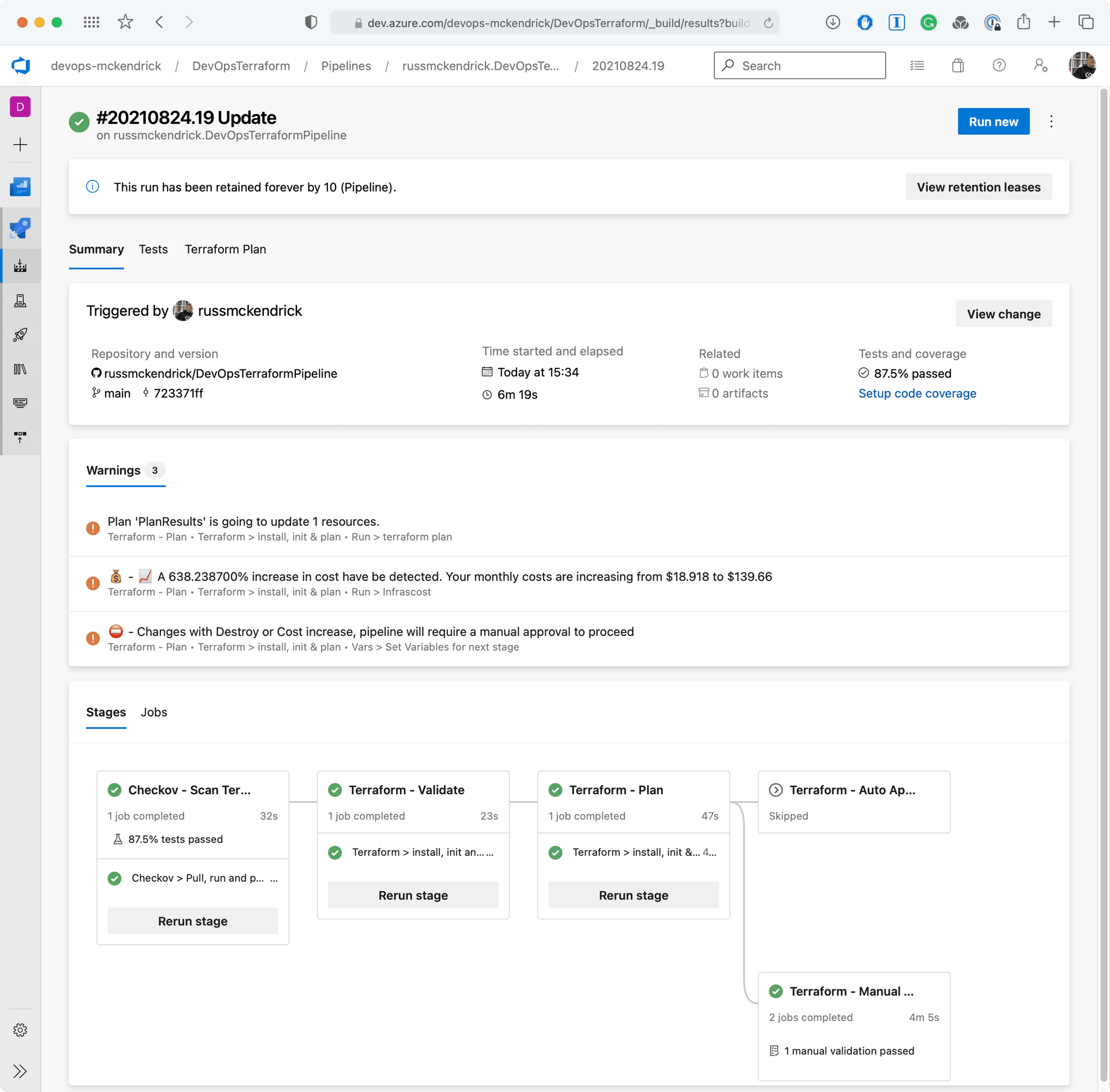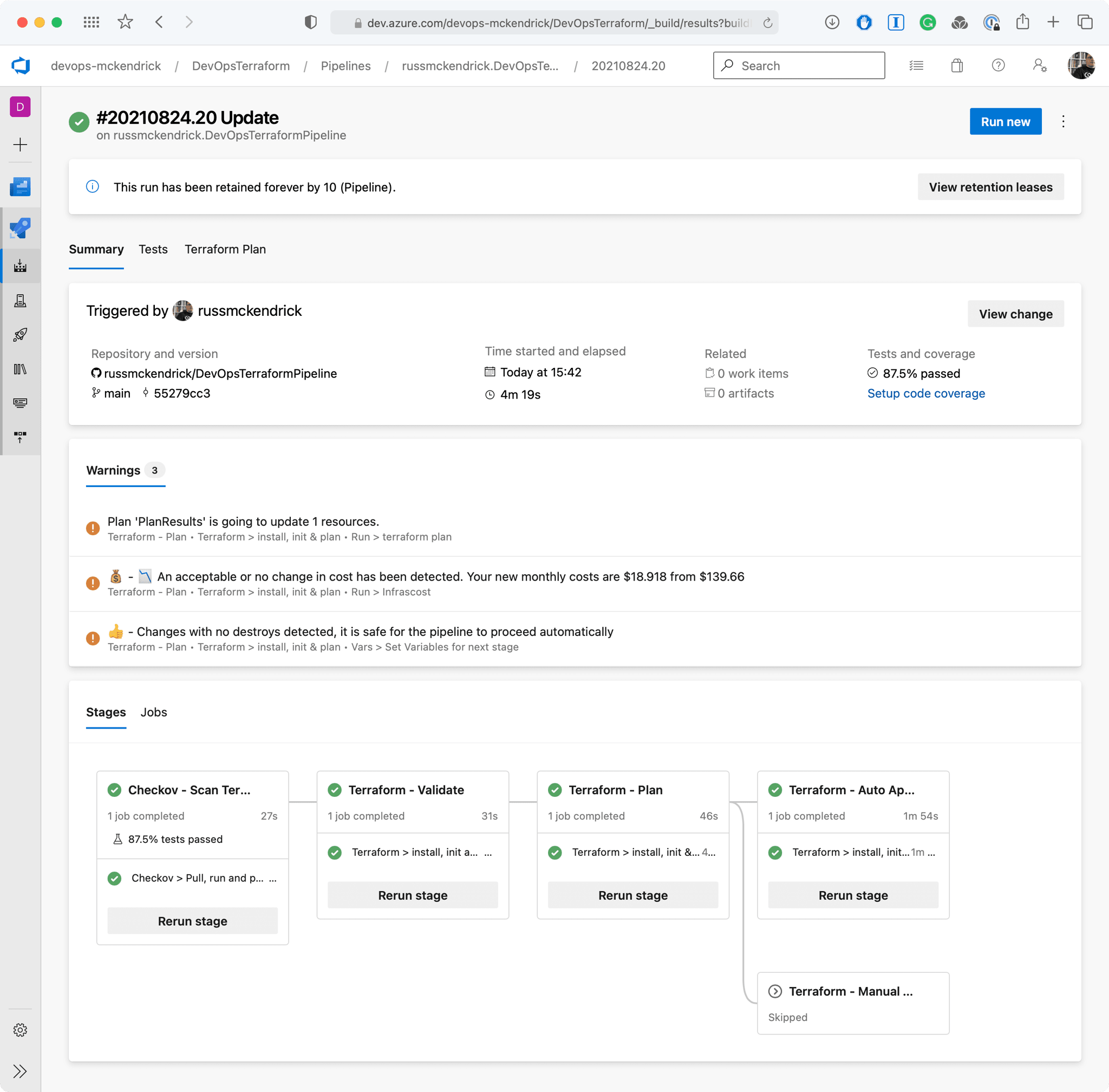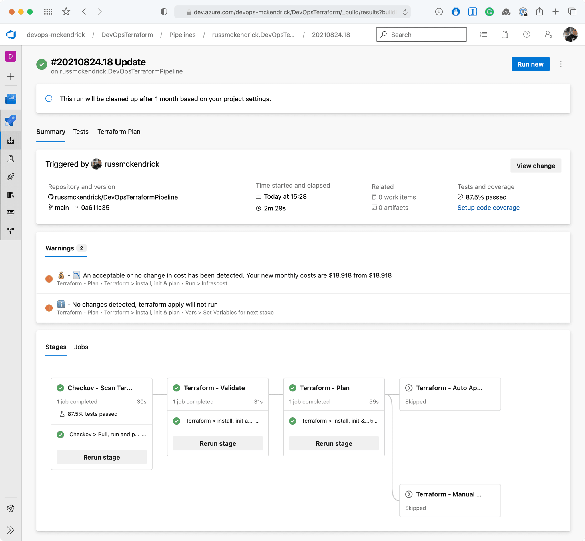 - **Checkov Scan**, there are no changes to [this stage](/2021/06/08/azure-devops-terraform-pipeline-with-checkov-approvals/#stage-checkovscan)- **Terraform Validate**, there are no changes to [this stage](/2021/06/08/azure-devops-terraform-pipeline-with-checkov-approvals/#stage-terraform-validate)- **Terraform Plan**, there is where all of the changes are and we will be covering this stage in more detail below.- **Terraform Apply (Auto Approval)**, there are no changes to [this stage](/2021/06/08/azure-devops-terraform-pipeline-with-checkov-approvals/#stage-terraform-apply-auto-approval)- **Terraform Apply (Manual Approval)**, there are some minor changes to [this stage](/2021/06/08/azure-devops-terraform-pipeline-with-checkov-approvals/#stage-terraform-apply-manual-approval), mostly around the wording