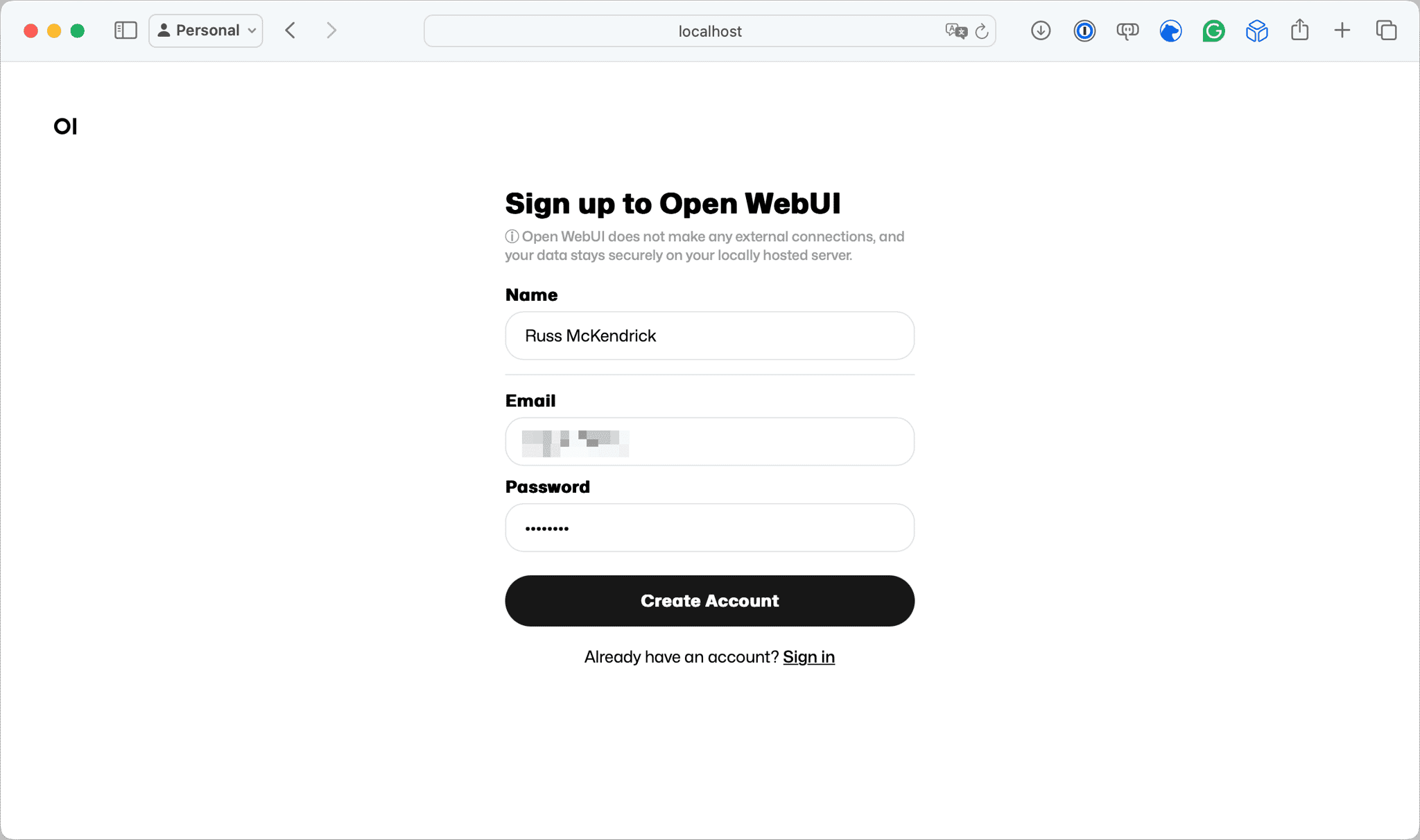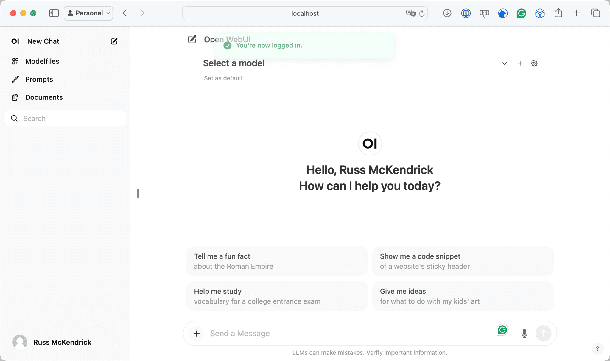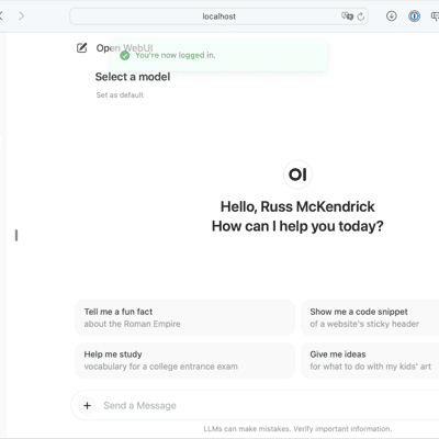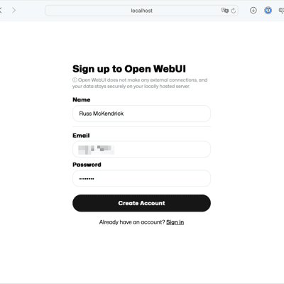 docker container run \ --detach \ --publish 3000:8080 \ --add-host=host.docker.internal:host-gateway \ --volume ~/Containers/open-webui:/app/backend/data \ --name open-webui \ --restart always \ ghcr.io/open-webui/open-webui:mainWith the container running, go to http://localhost:3000/.