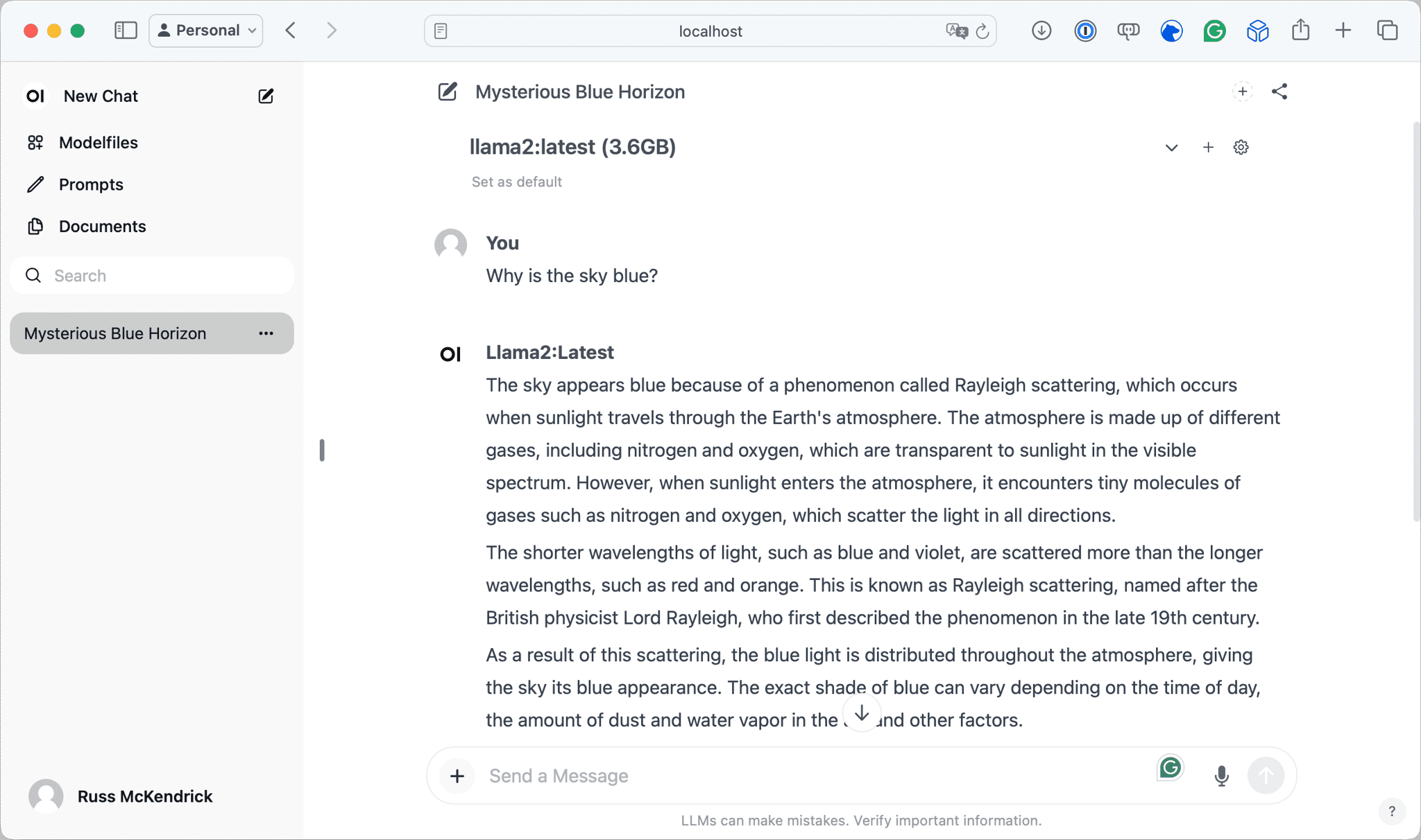 { "model": "llama2", "created_at": "2024-03-29T11:16:00.231151Z", "response": "\nThe sky appears blue because of a phenomenon called Rayleigh scattering. When sunlight enters Earth's atmosphere, it encounters tiny molecules of gases such as nitrogen and oxygen. These molecules scatter the light in all directions, but they scatter shorter (blue) wavelengths more than longer (red) wavelengths. This is known as Rayleigh scattering.\n\nAs a result of this scattering, the blue light is dispersed throughout the atmosphere, giving the sky its blue appearance. The blue light is scattered in all directions, but it is most visible in the direction of the sun, which is why the sky appears blue during the daytime.\n\nIt's worth noting that the color of the sky can appear different under different conditions. For example, during sunrise and sunset, the sky can take on hues of red, orange, and pink due to the angle of the sunlight and the scattering of light by atmospheric particles. In urban areas, the light pollution from city streets can make the sky appear more yellow or orange than blue.\n\nSo, to summarize, the sky appears blue because of Rayleigh scattering, which scatters shorter (blue) wavelengths of light more than longer (red) wavelengths, giving the appearance of a blue sky.", "done": true, "context": [ 518, 25580, 29962, 29889 ], "total_duration": 9717238042, "load_duration": 663584, "prompt_eval_duration": 167513000, "eval_count": 291, "eval_duration": 9548392000}In the output above, I truncated the context values as many exist.
