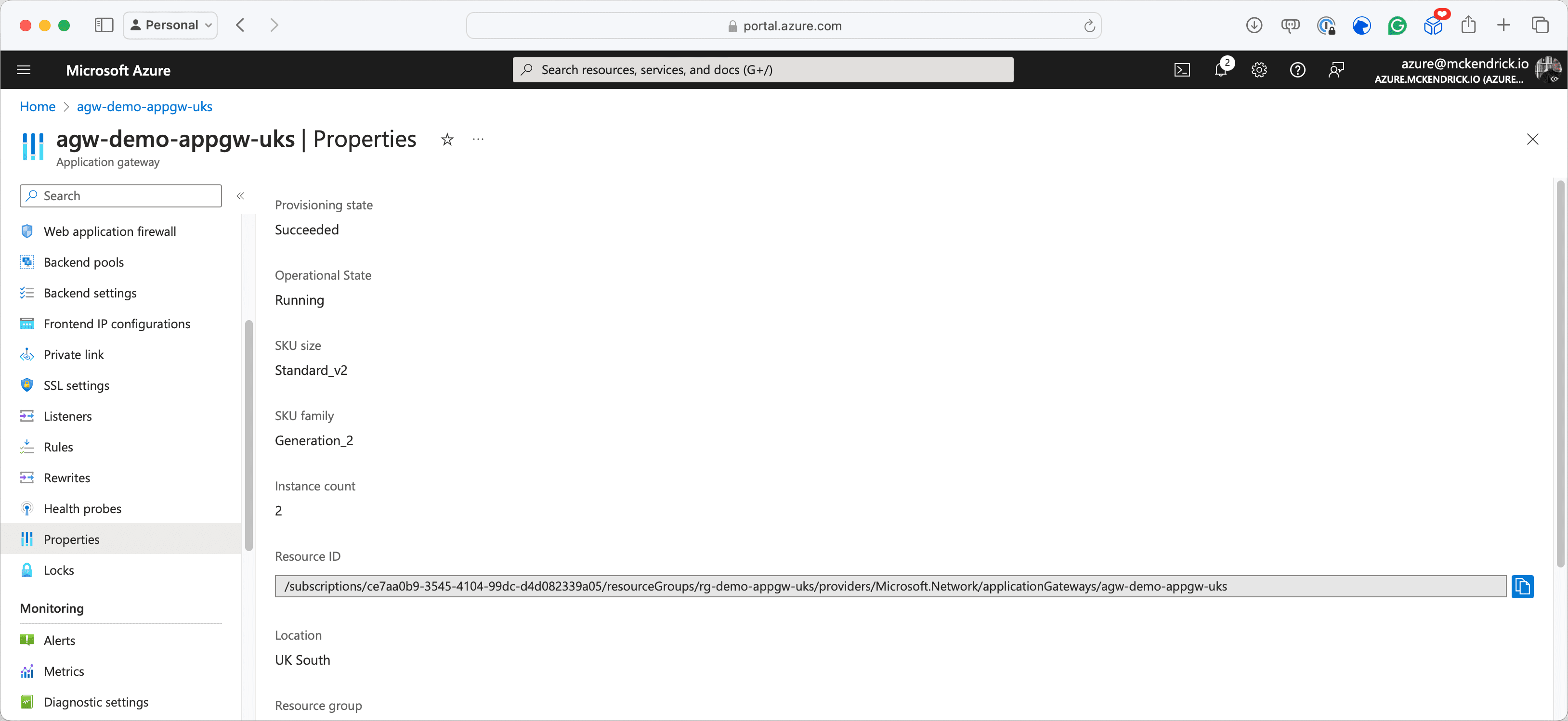 As you can see from the screens above, the Azure Logic App ran, and because the Application Gateway had an Operational State of Running, it Stopped the Azure Application Gateway. You can check the Operational State by going to the Azure Application Gateway in the Azure portal and going to Properties in the left-hand menu.