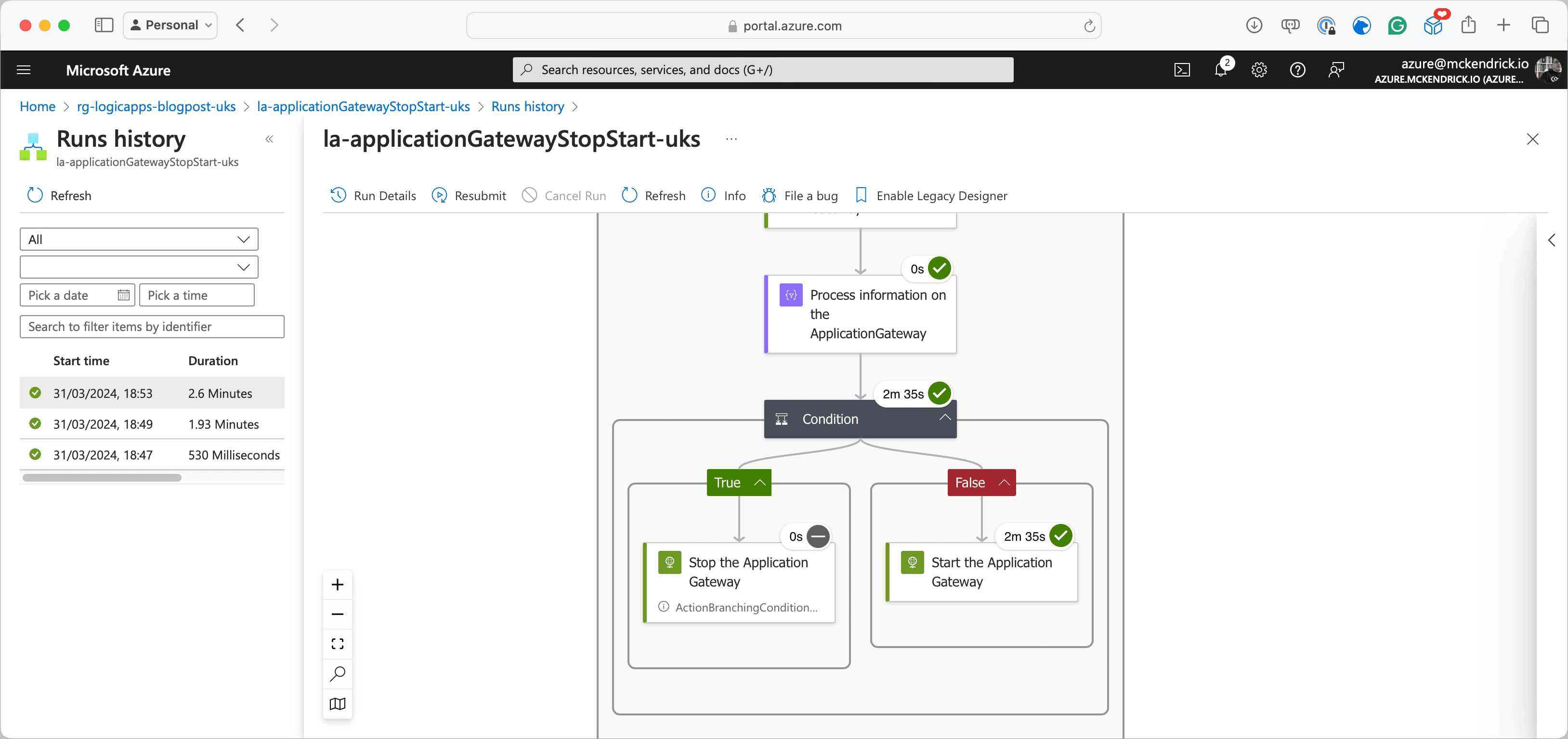 { "type": "If", "expression": { "and": [ { "equals": [ "@body('Process_information_on_the_ApplicationGateway')['properties']['operationalState']", "Running" ] } ] }, "actions": { "Stop_the_Application_Gateway": { "type": "Http", "inputs": { "uri": "https://management.azure.com/@{items('For_Each_App_Gateway')['id']}/stop?api-version=2023-09-01", "method": "POST", "authentication": { "identity": "@{parameters('managedId')}", "type": "ManagedServiceIdentity" } }, "runtimeConfiguration": { "contentTransfer": { "transferMode": "Chunked" } } } }, "else": { "actions": { "Start_the_Application_Gateway": { "type": "Http", "inputs": { "uri": "https://management.azure.com/@{items('For_Each_App_Gateway')['id']}/start?api-version=2023-09-01", "method": "POST", "authentication": { "audience": "", "identity": "@{parameters('managedId')}", "type": "ManagedServiceIdentity" } }, "runtimeConfiguration": { "contentTransfer": { "transferMode": "Chunked" } } } } }, "runAfter": { "Process_information_on_the_ApplicationGateway": [ "Succeeded" ] }}As the Azure Application Gateway was running when we ran the Azure Logic App the first time, the run stopped the Application Gateway: