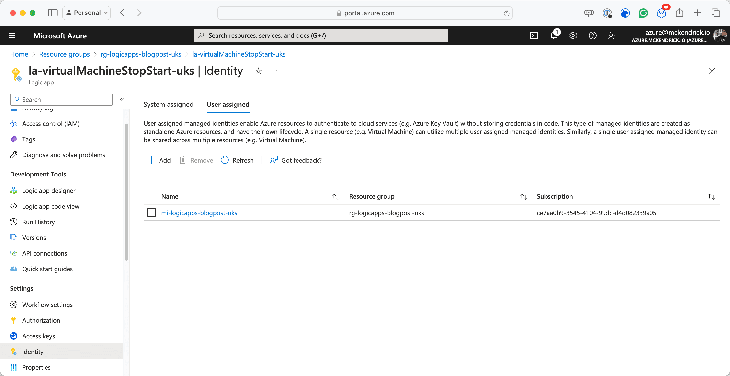 az role assignment create \ --assignee-principal-type "ServicePrincipal" \ --assignee-object "$(az identity show --resource-group $RESOURCE_GROUP_NAME --name $MANAGED_ID_NAME --query principalId --output tsv)" \ --role "Virtual Machine Contributor" \ --scope "/subscriptions/$SUBSCRIPTION_ID"With the User Managed Identity in place, we can now create the Azure Logic App.