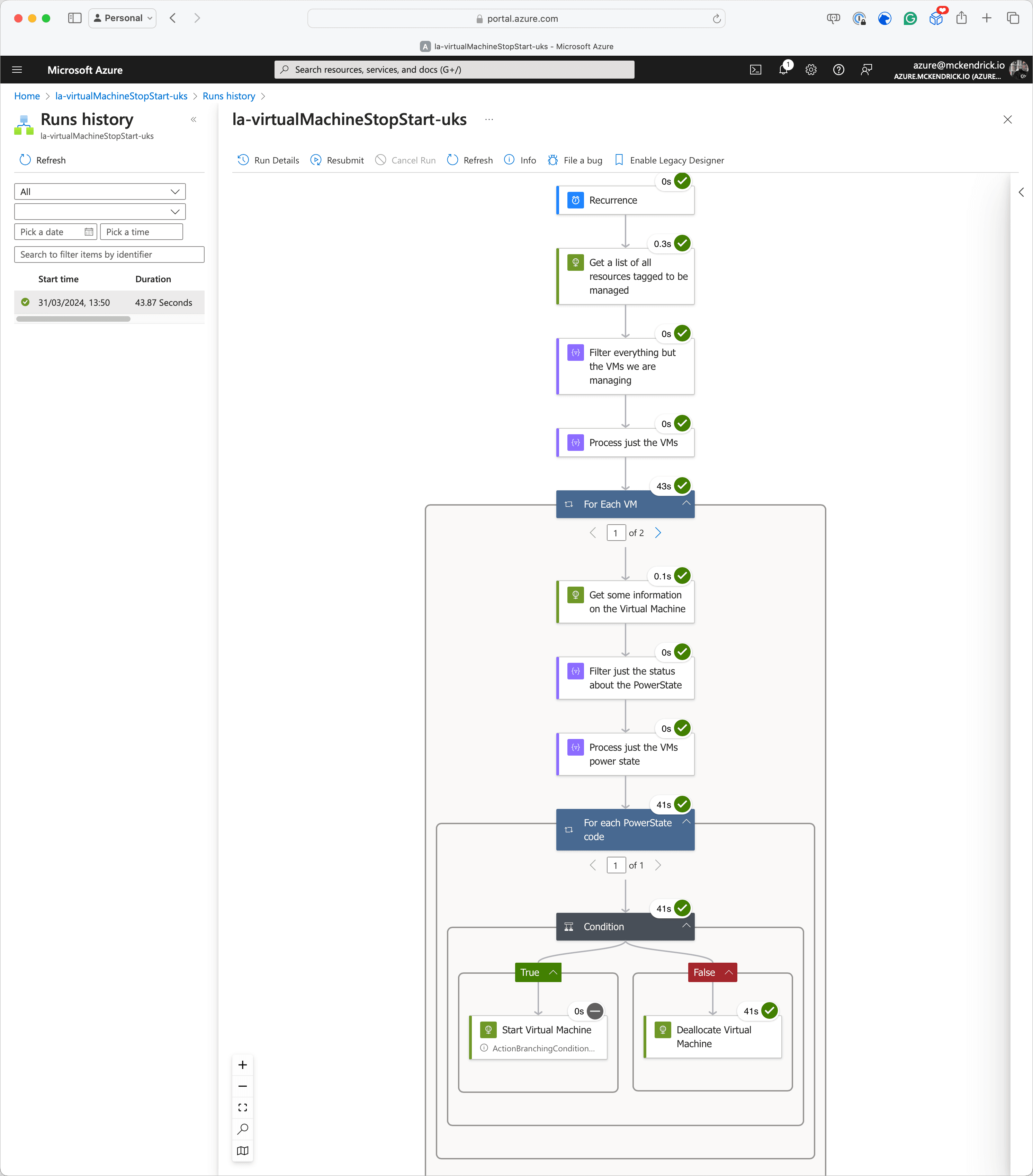 As you can see from the screens above, the Logic App ran, and because the two tagged Virtual Machines were running - it powered them down; well, actually - it Stopped and Deallocated them, so we are not charged while they are in the Stopped state.