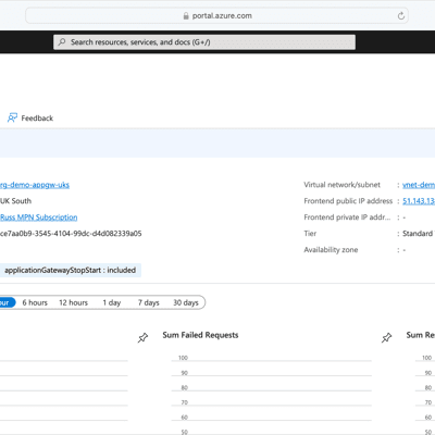 { "name": "agw-demo-appgw-uks", "id": "/subscriptions/ce7aa0b9-3545-4104-99dc-d4d082339a05/resourceGroups/rg-demo-appgw-uks/providers/Microsoft.Network/applicationGateways/agw-demo-appgw-uks", "etag": "W/\"5599fe28-15f0-40b8-a25d-56971263aaf8\"", "type": "Microsoft.Network/applicationGateways", "location": "uksouth", "tags": { "applicationGatewayStopStart": "included" }, "properties": { "provisioningState": "Succeeded", "resourceGuid": "39ae7e1b-3890-4bc5-a12d-37f885c607aa", "sku": { "name": "Standard_v2", "tier": "Standard_v2", "family": "Generation_2", "capacity": 2 }, "operationalState": "Running", "gatewayIPConfigurations": [ { "name": "appGatewayFrontendIP", "id": "/subscriptions/ce7aa0b9-3545-4104-99dc-d4d082339a05/resourceGroups/rg-demo-appgw-uks/providers/Microsoft.Network/applicationGateways/agw-demo-appgw-uks/gatewayIPConfigurations/appGatewayFrontendIP", "etag": "W/\"5599fe28-15f0-40b8-a25d-56971263aaf8\"", "properties": { "provisioningState": "Succeeded", "subnet": { "id": "/subscriptions/ce7aa0b9-3545-4104-99dc-d4d082339a05/resourceGroups/rg-demo-appgw-uks/providers/Microsoft.Network/virtualNetworks/vnet-demo-appgw-uks/subnets/sub-appwg" } }, "type": "Microsoft.Network/applicationGateways/gatewayIPConfigurations" } ], "sslCertificates": [], "trustedRootCertificates": [], "trustedClientCertificates": [], "sslProfiles": [], "frontendIPConfigurations": [ { "name": "appGatewayFrontendIP", "id": "/subscriptions/ce7aa0b9-3545-4104-99dc-d4d082339a05/resourceGroups/rg-demo-appgw-uks/providers/Microsoft.Network/applicationGateways/agw-demo-appgw-uks/frontendIPConfigurations/appGatewayFrontendIP", "etag": "W/\"5599fe28-15f0-40b8-a25d-56971263aaf8\"", "type": "Microsoft.Network/applicationGateways/frontendIPConfigurations", "properties": { "provisioningState": "Succeeded", "privateIPAllocationMethod": "Dynamic", "publicIPAddress": { "id": "/subscriptions/ce7aa0b9-3545-4104-99dc-d4d082339a05/resourceGroups/rg-demo-appgw-uks/providers/Microsoft.Network/publicIPAddresses/pip-agw-demo-appgw-uks" }, "httpListeners": [ { "id": "/subscriptions/ce7aa0b9-3545-4104-99dc-d4d082339a05/resourceGroups/rg-demo-appgw-uks/providers/Microsoft.Network/applicationGateways/agw-demo-appgw-uks/httpListeners/appGatewayHttpListener" } ] } } ], "frontendPorts": [ { "name": "appGatewayFrontendPort", "id": "/subscriptions/ce7aa0b9-3545-4104-99dc-d4d082339a05/resourceGroups/rg-demo-appgw-uks/providers/Microsoft.Network/applicationGateways/agw-demo-appgw-uks/frontendPorts/appGatewayFrontendPort", "etag": "W/\"5599fe28-15f0-40b8-a25d-56971263aaf8\"", "properties": { "provisioningState": "Succeeded", "port": 80, "httpListeners": [ { "id": "/subscriptions/ce7aa0b9-3545-4104-99dc-d4d082339a05/resourceGroups/rg-demo-appgw-uks/providers/Microsoft.Network/applicationGateways/agw-demo-appgw-uks/httpListeners/appGatewayHttpListener" } ] }, "type": "Microsoft.Network/applicationGateways/frontendPorts" } ], "backendAddressPools": [ { "name": "appGatewayBackendPool", "id": "/subscriptions/ce7aa0b9-3545-4104-99dc-d4d082339a05/resourceGroups/rg-demo-appgw-uks/providers/Microsoft.Network/applicationGateways/agw-demo-appgw-uks/backendAddressPools/appGatewayBackendPool", "etag": "W/\"5599fe28-15f0-40b8-a25d-56971263aaf8\"", "properties": { "provisioningState": "Succeeded", "backendAddresses": [], "requestRoutingRules": [ { "id": "/subscriptions/ce7aa0b9-3545-4104-99dc-d4d082339a05/resourceGroups/rg-demo-appgw-uks/providers/Microsoft.Network/applicationGateways/agw-demo-appgw-uks/requestRoutingRules/rule1" } ] }, "type": "Microsoft.Network/applicationGateways/backendAddressPools" } ], "loadDistributionPolicies": [], "backendHttpSettingsCollection": [ { "name": "appGatewayBackendHttpSettings", "id": "/subscriptions/ce7aa0b9-3545-4104-99dc-d4d082339a05/resourceGroups/rg-demo-appgw-uks/providers/Microsoft.Network/applicationGateways/agw-demo-appgw-uks/backendHttpSettingsCollection/appGatewayBackendHttpSettings", "etag": "W/\"5599fe28-15f0-40b8-a25d-56971263aaf8\"", "properties": { "provisioningState": "Succeeded", "port": 80, "protocol": "Http", "cookieBasedAffinity": "Disabled", "connectionDraining": { "enabled": false, "drainTimeoutInSec": 1 }, "pickHostNameFromBackendAddress": false, "requestTimeout": 30, "requestRoutingRules": [ { "id": "/subscriptions/ce7aa0b9-3545-4104-99dc-d4d082339a05/resourceGroups/rg-demo-appgw-uks/providers/Microsoft.Network/applicationGateways/agw-demo-appgw-uks/requestRoutingRules/rule1" } ] }, "type": "Microsoft.Network/applicationGateways/backendHttpSettingsCollection" } ], "backendSettingsCollection": [], "httpListeners": [ { "name": "appGatewayHttpListener", "id": "/subscriptions/ce7aa0b9-3545-4104-99dc-d4d082339a05/resourceGroups/rg-demo-appgw-uks/providers/Microsoft.Network/applicationGateways/agw-demo-appgw-uks/httpListeners/appGatewayHttpListener", "etag": "W/\"5599fe28-15f0-40b8-a25d-56971263aaf8\"", "properties": { "provisioningState": "Succeeded", "frontendIPConfiguration": { "id": "/subscriptions/ce7aa0b9-3545-4104-99dc-d4d082339a05/resourceGroups/rg-demo-appgw-uks/providers/Microsoft.Network/applicationGateways/agw-demo-appgw-uks/frontendIPConfigurations/appGatewayFrontendIP" }, "frontendPort": { "id": "/subscriptions/ce7aa0b9-3545-4104-99dc-d4d082339a05/resourceGroups/rg-demo-appgw-uks/providers/Microsoft.Network/applicationGateways/agw-demo-appgw-uks/frontendPorts/appGatewayFrontendPort" }, "protocol": "Http", "hostNames": [], "requireServerNameIndication": false, "enableHttp3": false, "requestRoutingRules": [ { "id": "/subscriptions/ce7aa0b9-3545-4104-99dc-d4d082339a05/resourceGroups/rg-demo-appgw-uks/providers/Microsoft.Network/applicationGateways/agw-demo-appgw-uks/requestRoutingRules/rule1" } ] }, "type": "Microsoft.Network/applicationGateways/httpListeners" } ], "listeners": [], "urlPathMaps": [], "requestRoutingRules": [ { "name": "rule1", "id": "/subscriptions/ce7aa0b9-3545-4104-99dc-d4d082339a05/resourceGroups/rg-demo-appgw-uks/providers/Microsoft.Network/applicationGateways/agw-demo