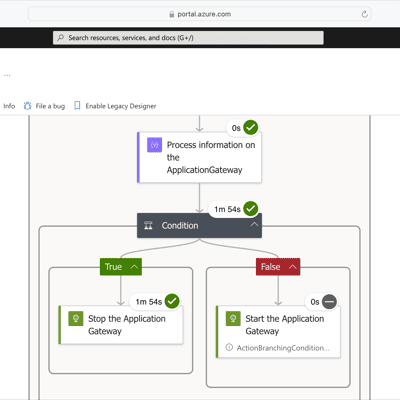 { "type": "If", "expression": { "and": [ { "equals": [ "@body('Process_information_on_the_ApplicationGateway')['properties']['operationalState']", "Running" ] } ] }, "actions": { "Stop_the_Application_Gateway": { "type": "Http", "inputs": { "uri": "https://management.azure.com/@{items('For_Each_App_Gateway')['id']}/stop?api-version=2023-09-01", "method": "POST", "authentication": { "identity": "@{parameters('managedId')}", "type": "ManagedServiceIdentity" } }, "runtimeConfiguration": { "contentTransfer": { "transferMode": "Chunked" } } } }, "else": { "actions": { "Start_the_Application_Gateway": { "type": "Http", "inputs": { "uri": "https://management.azure.com/@{items('For_Each_App_Gateway')['id']}/start?api-version=2023-09-01", "method": "POST", "authentication": { "audience": "", "identity": "@{parameters('managedId')}", "type": "ManagedServiceIdentity" } }, "runtimeConfiguration": { "contentTransfer": { "transferMode": "Chunked" } } } } }, "runAfter": { "Process_information_on_the_ApplicationGateway": [ "Succeeded" ] }}As the Azure Application Gateway was running when we ran the Azure Logic App the first time, the run stopped the Application Gateway: