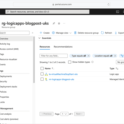 export RESOURCE_GROUP_NAME="rg-logicapps-blogpost-uks"export REGION="uksouth"export SUBSCRIPTION_ID=$(az account show --query id --output tsv)export MANAGED_ID_NAME="mi-logicapps-blogpost-uks"export LOGIC_APP_NAME="la-virtualMachineStopStart-uks"With the variables in place, we can deploy the resource group;