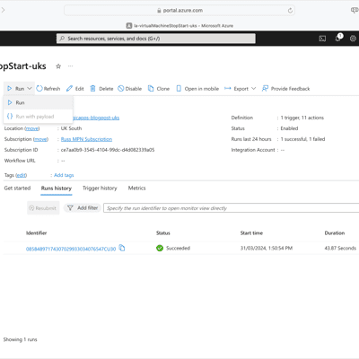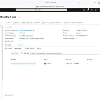 for i in {1..3}; do if [ $i -le 2 ]; then az vm create \ --resource-group $RESOURCE_GROUP_NAME \ --name $VM_NAME-$(openssl rand -hex 5)-uks \ --image $VM_IMAGE \ --admin-username azureuser \ --vnet-name $VNET_NAME \ --subnet $SUBNET_NAME \ --generate-ssh-keys \ --public-ip-address "" \ --size Standard_B2ms \ --tags "virtualMachineStopStart=included" else az vm create \ --resource-group $RESOURCE_GROUP_NAME \ --name $VM_NAME-$(openssl rand -hex 5)-uks \ --image $VM_IMAGE \ --admin-username azureuser \ --vnet-name $VNET_NAME \ --subnet $SUBNET_NAME \ --generate-ssh-keys \ --public-ip-address "" \ --size Standard_B2ms fidoneWith the resources now deployed, let’s run the Azure Logic App and start saving money.