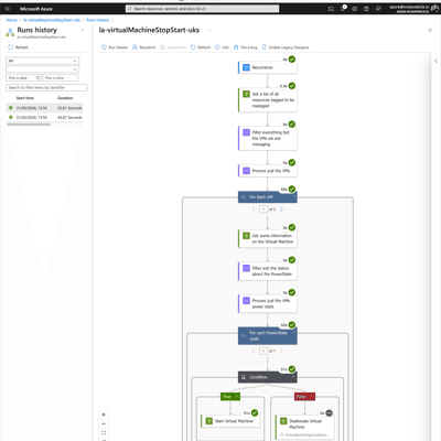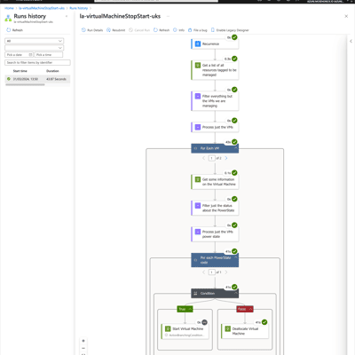 { "type": "If", "expression": { "and": [ { "equals": [ "@items('For_each_PowerState_code')['code']", "PowerState/deallocated" ] } ] }, "actions": { "Start_Virtual_Machine": { "type": "Http", "inputs": { "uri": "https://management.azure.com@{items('For_Each_VM')['id']}/start?api-version=2024-03-01", "method": "POST", "authentication": { "identity": "@{parameters('managedId')}", "type": "ManagedServiceIdentity" } }, "runtimeConfiguration": { "contentTransfer": { "transferMode": "Chunked" } } } }, "else": { "actions": { "Deallocate_Virtual_Machine": { "type": "Http", "inputs": { "uri": "https://management.azure.com@{items('For_Each_VM')['id']}/deallocate?api-version=2024-03-01", "method": "POST", "authentication": { "identity": "@{parameters('managedId')}", "type": "ManagedServiceIdentity" } }, "runtimeConfiguration": { "contentTransfer": { "transferMode": "Chunked" } } } } }}In our first run, this final task’s output was False, so the virtual machines were deallocated, as you can see from the results below: