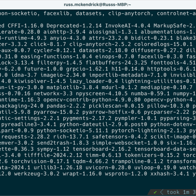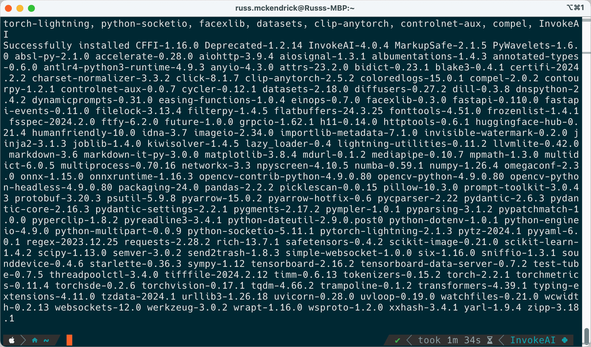 pip install InvokeAI --use-pep517 --extra-index-url https://download.pytorch.org/whl/cu121As you can see, it installs alot of packages and takes a few minutes to download and install everything.