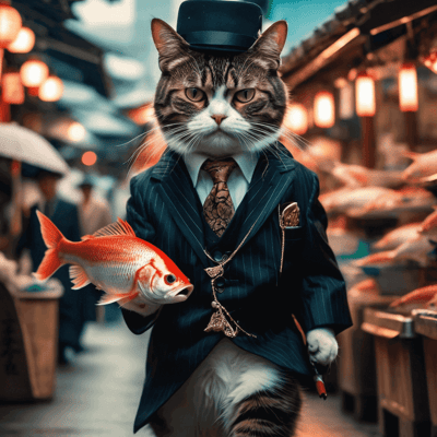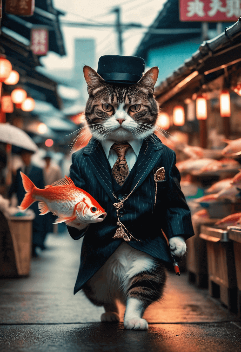 A hyperdetailed photograph of a Cat dressed as a mafia boss holding a fish walking down a Japanese fish market with an angry face, 8k resolution, best quality, beautiful photograph, dynamic lighting,