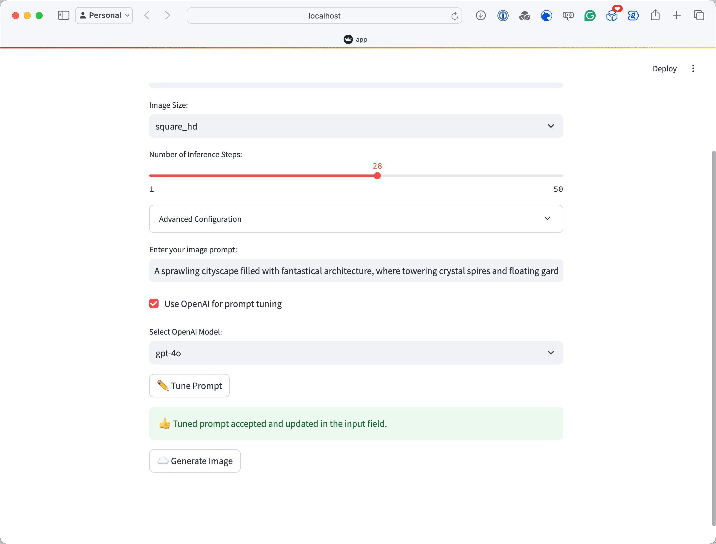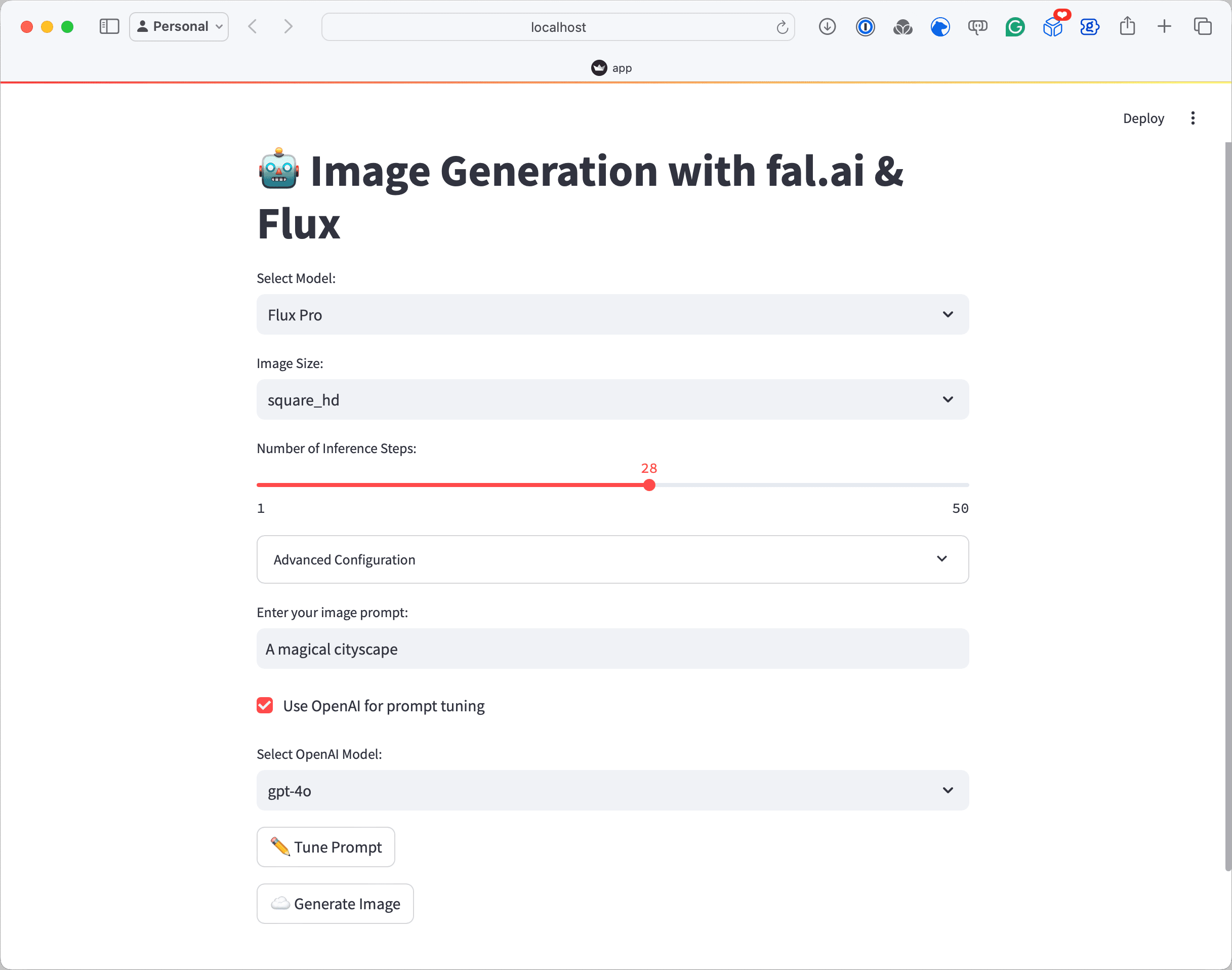 conda create -n streamlit python=3.12conda activate streamlitgit clone https://github.com/russmckendrick/flux-fal-openai-streamlit.gitcd flux-fal-openai-streamlitpip install -r requirements.txtLaunching the application
