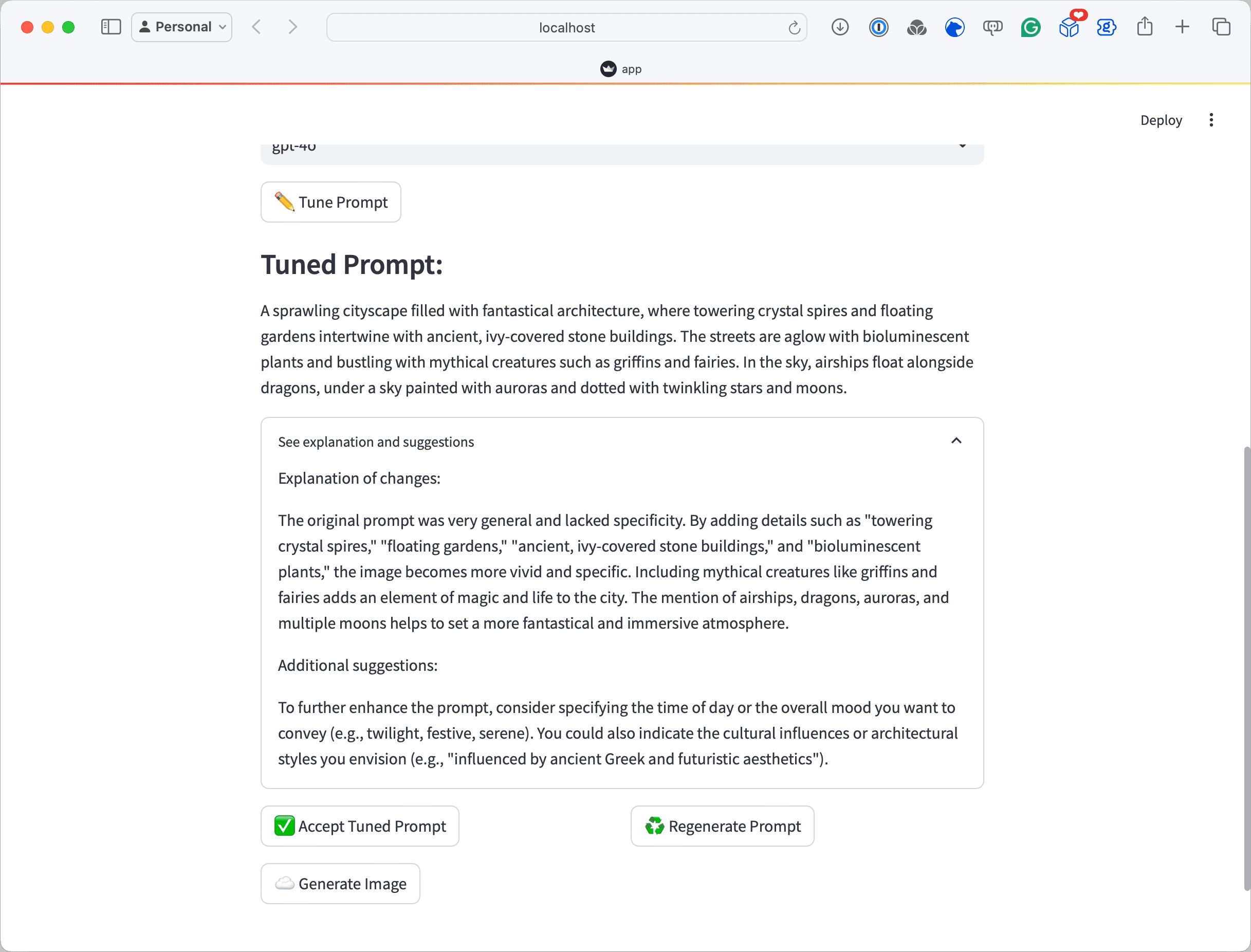 client = openai.OpenAI(api_key=openai_api_key) response = client.chat.completions.create( model=model, messages=[ { "role": "system", "content": "You are an advanced AI assistant specialized in refining and enhancing image generation prompts. Your goal is to help users create more effective, detailed, and creative prompts for high-quality images. Respond with: 1) An improved prompt (prefix with 'PROMPT:'), 2) Explanation of changes (prefix with 'EXPLANATION:'), and 3) Additional suggestions (prefix with 'SUGGESTIONS:'). Each section should be on a new line." }, { "role": "user", "content": f"Improve this image generation prompt: {prompt}" } ] ) return response.choices[0].message.content.strip()As you can see from the system prompt below, we are instructing the model to not only generate the prompt but also everything else and how it should format its response: