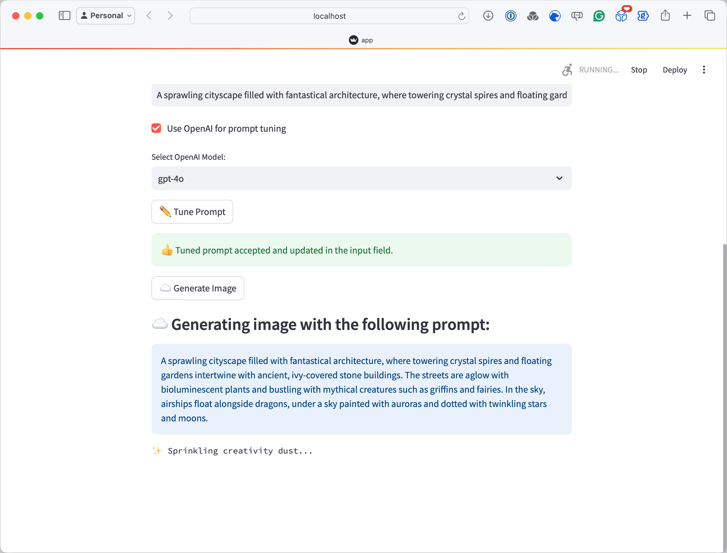 def cycle_spinner_messages(): messages = [ "🎨 Mixing colors...", "✨ Sprinkling creativity dust...", "🖌️ Applying artistic strokes...", "🌈 Infusing with vibrant hues...", "🔍 Focusing on details...", "🖼️ Framing the masterpiece...", "🌟 Adding that special touch...", "🎭 Bringing characters to life...", "🏙️ Building the scene...", "🌅 Setting the perfect mood...", ] return itertools.cycle(messages)When I said Streamlit made creating web applications really easy, I wasn’t kidding. The code below generates the bulk of what you see on the initial screen: