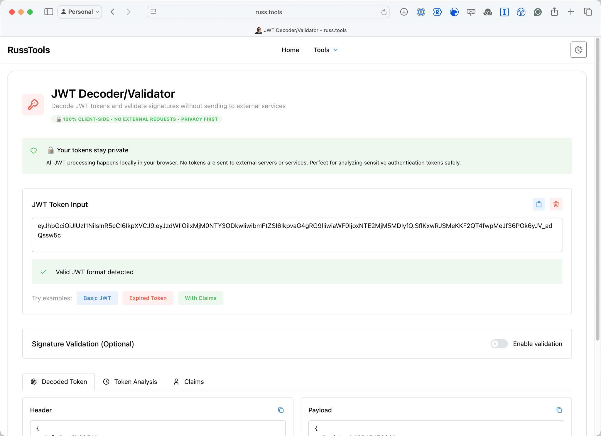 - JWT Decoder/Validator; Decode JWT tokens and validate signatures without sending to external services
