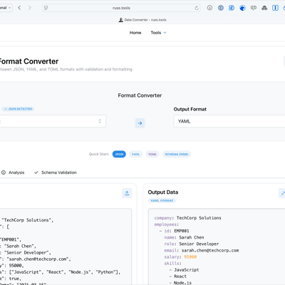 - Data Format Converter; Convert between JSON, YAML, and TOML formats with validation and formatting