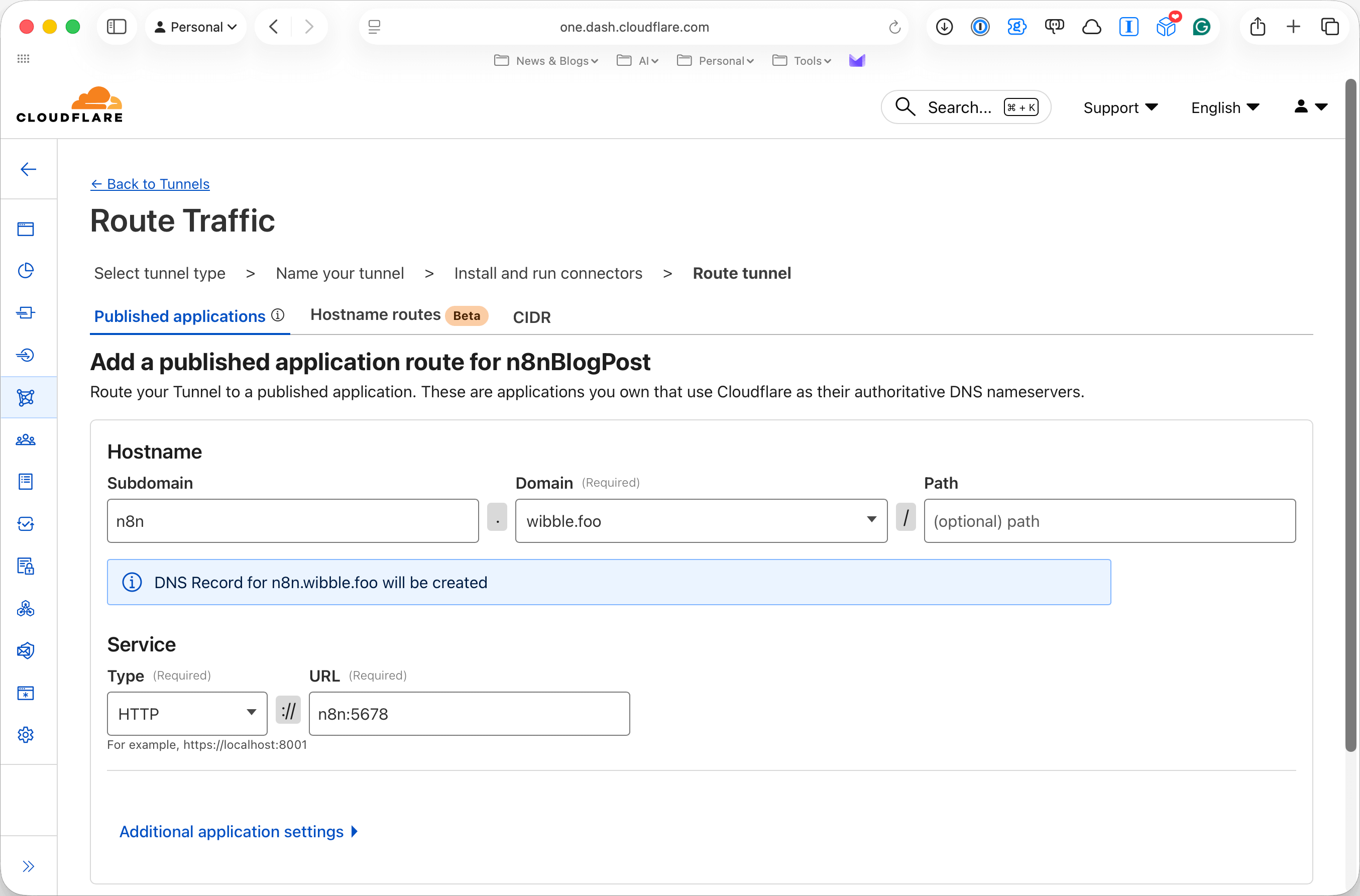 Next give your application a name, in the screens below I have called mine n8nBlogPost, then in the public hostname section enter the URL of your n8n instance, in the screens below I have entered n8n.wibble.foo: