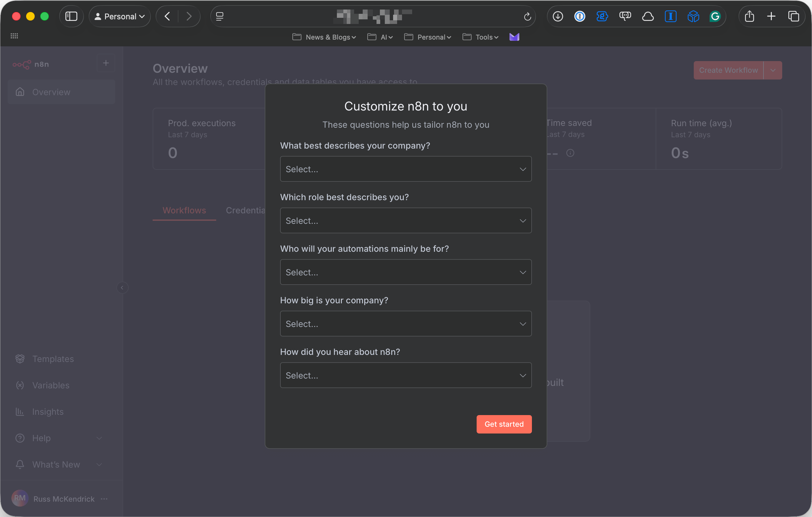 Once configured and goto your n8n domain you should be prompted to login with Cloudflare, once you have done this you will be taken to the n8n editor: