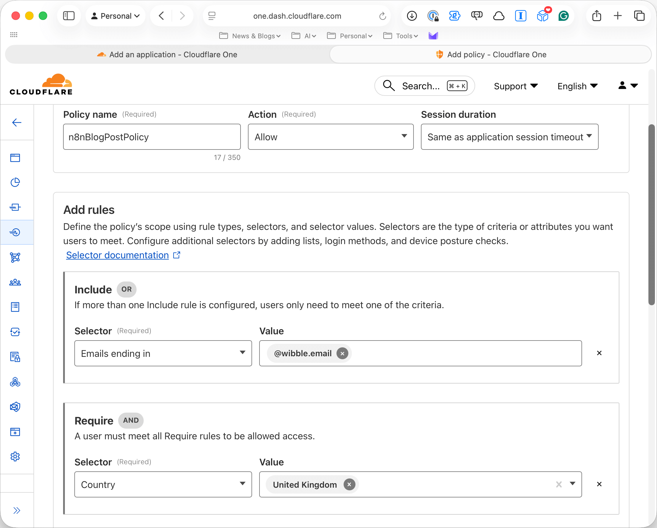 Now we need to add a policy to the application, click on + Create new policy where you will be taken to the Add policy screen, here enter a name for the policy, I have called mine n8nBlogPostPolicy. Then scroll down to the Add rules section, by default there will an Include rule waiting to be added, in the Selector select Emails ending in and enter the domain name of your email provider, in my example I have entered wibble.email. Now click on + Add require, in the Selector this time select Country and enter the country(s) you want to allow access from, in my example I have entered United Kingdom and click on Next.