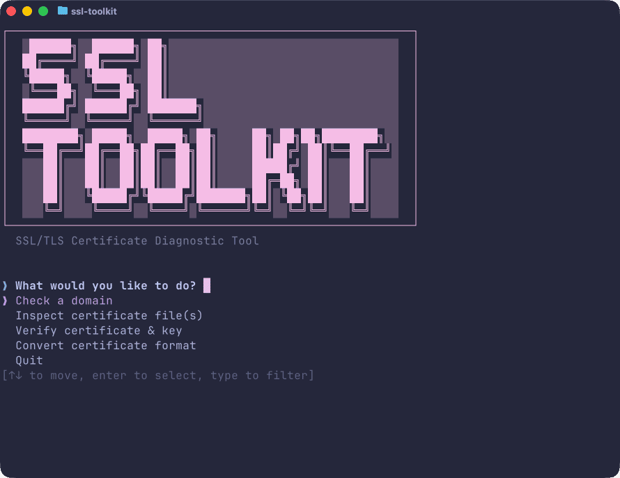 ssl-toolkitThis presents a top-level menu with options to check a domain, inspect certificate files, verify certificate and key pairs, or convert between certificate formats. Each option guides you through the required inputs and displays results in a scrollable pager.