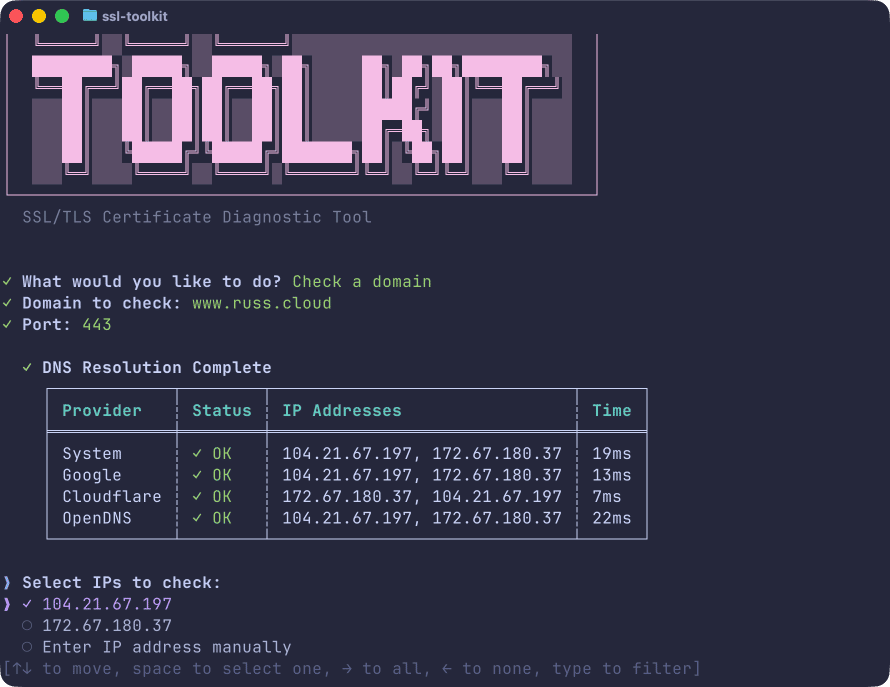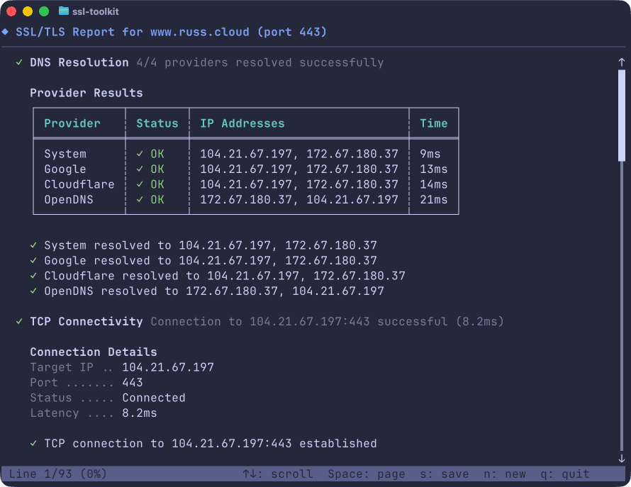 ssl-toolkit -d github.com --non-interactiveThis runs through all the checks and outputs a detailed report covering DNS resolution from multiple providers (Google, Cloudflare, OpenDNS, and your system resolver), TCP connectivity, TLS protocol and cipher analysis, certificate chain validation, and WHOIS information.