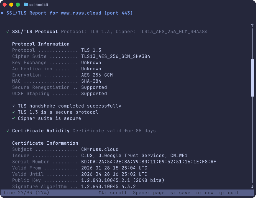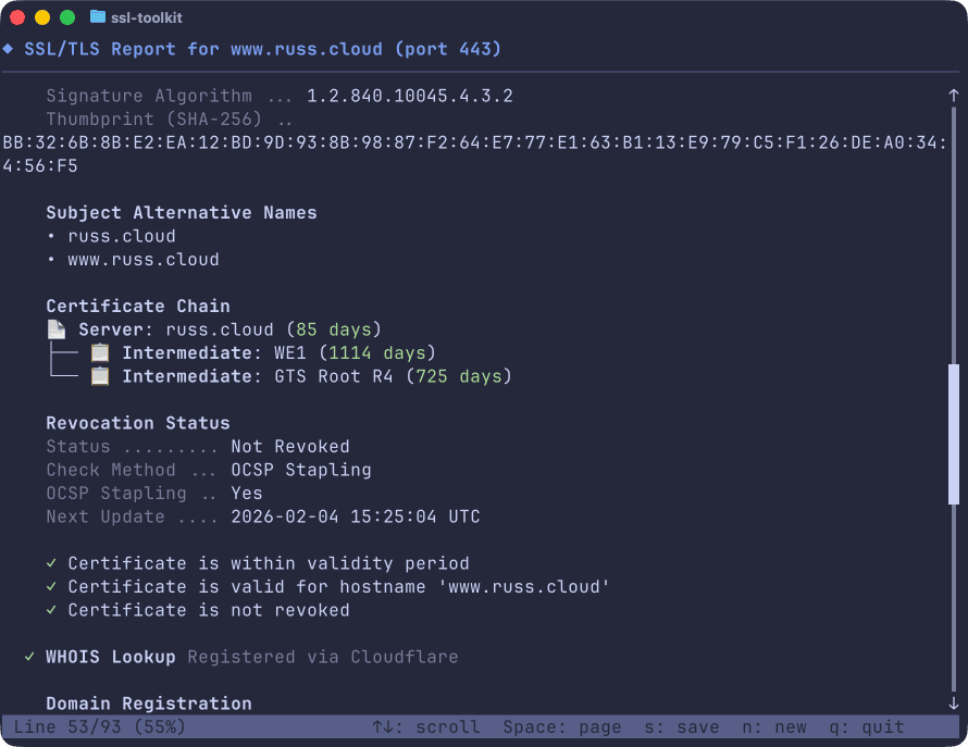 ssl-toolkit -d www.russ.cloud --json --non-interactiveThis gives you the following output: