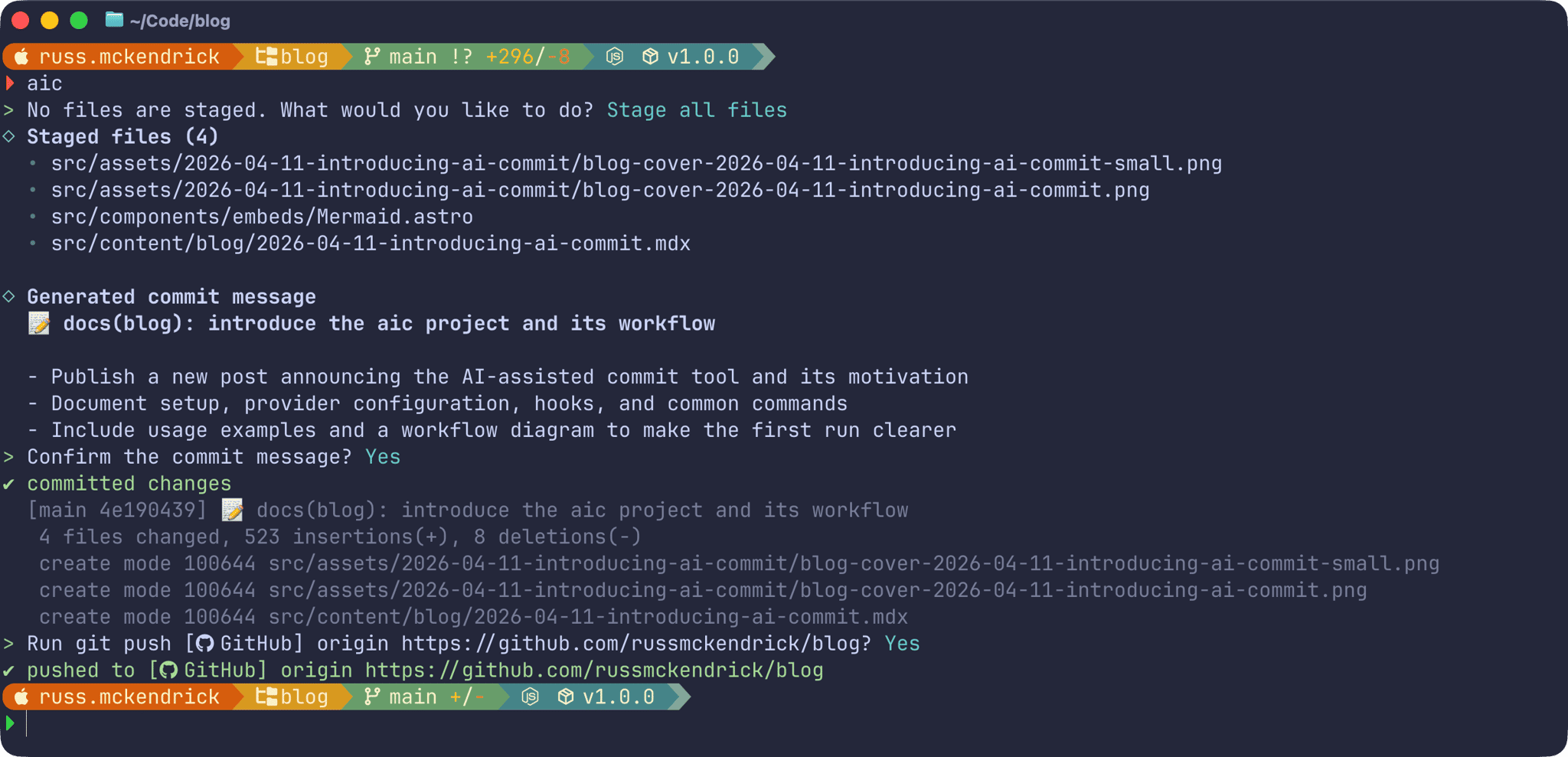 So I used AI to build an AI tool to fix that. AI Commit is a Rust CLI that reads your staged diff and generates a commit message for you. The binary is aic, it supports several AI providers including local ones, and it’s been in daily use here since the early builds.